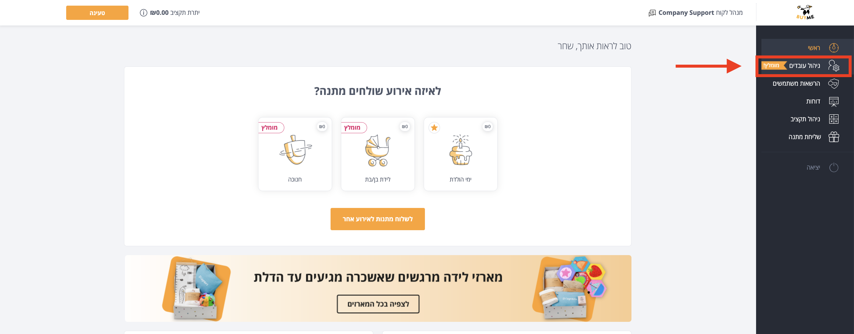 שימו לב: אזור ניהול עובדים לא יהיה זמין לך במערכת, במידה וקיימת אצלך פעילות לשליחת מתנות ימי הולדת או מתנות ותק בצורה אוטומטית. אפשר לרשום לנו כאן - ובכמה קליקים אנחנו מסדרים את זה :)